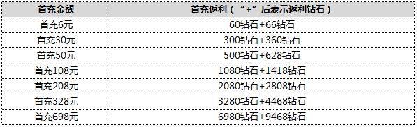 活动内容:充值面额除了月卡和周卡外,所有面额首次充值钻石双倍钻石返还。即: