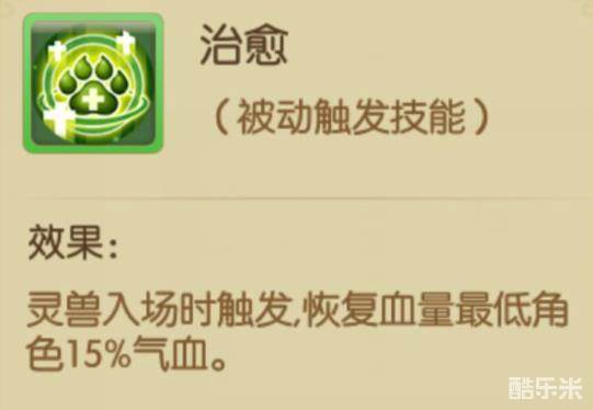 治愈:灵兽入场时触发,恢复血量最低角色15%的气血。