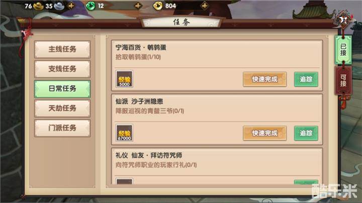 寻仙的任务系统包括主线任务、支线任务、日常任务、帮派任务以及隐藏任务,相比较其他游戏来说还是最大的不同就在于探索任务以及帮派任务。寻仙的任务系统就在游戏界面的右侧,如果你找不到,恩,试试看点一下界面左侧的小箭头。
