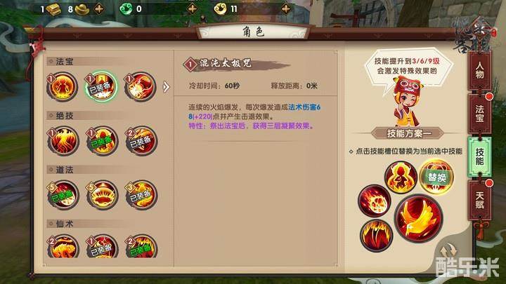 法宝技能优先选择紫烟神火术与混沌太极咒。紫烟神火术使用后会提高自身法术效果并形成法术护罩,即增加了输出又保证了生存,在与对手遭遇时,应首先开出此技能。而混沌太极咒附带的击退效果,对于法师类职业来说,是拉开距离,平稳输出的重要保证。