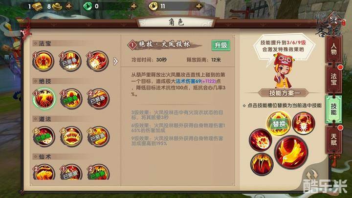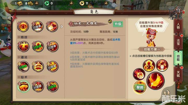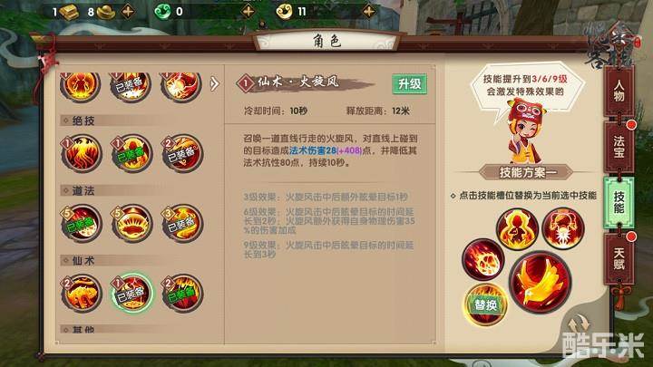 仙术建议携带火猴术和火旋风。火猴术技能CD较短,且附带的击倒效果对于控制对手,拿到先手非常重要。火旋风的伤害较高,且附带降低对手法术抗性的效果,作用较大