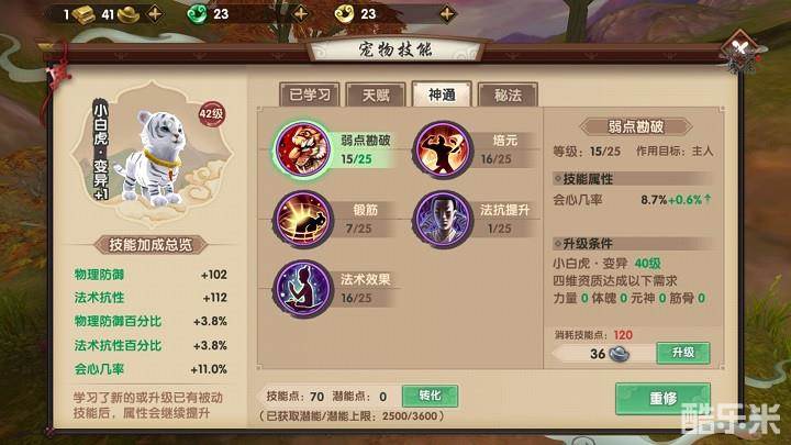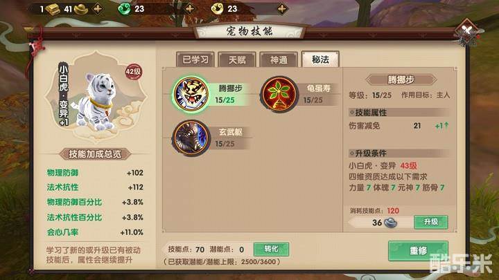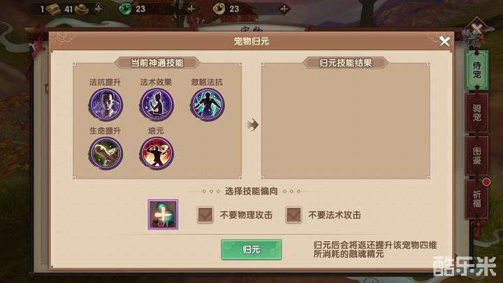 宠物归元选择合适的技能后,便需要对宠物的技能进行升级了。需要注意的是,宠物技能分为主动技能和被动技能。被动技能又分为神通和秘法两种。技能随机归元的的都是宠物的被动技能,主动技能是不可以归元的。另外,仙友们归元的都是宠物的神通技能,秘法技能是不可归元的。