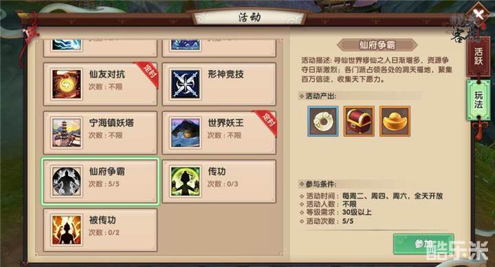 2.活动要求:玩家等级达到30级以上,且门派参加仙府争霸活动