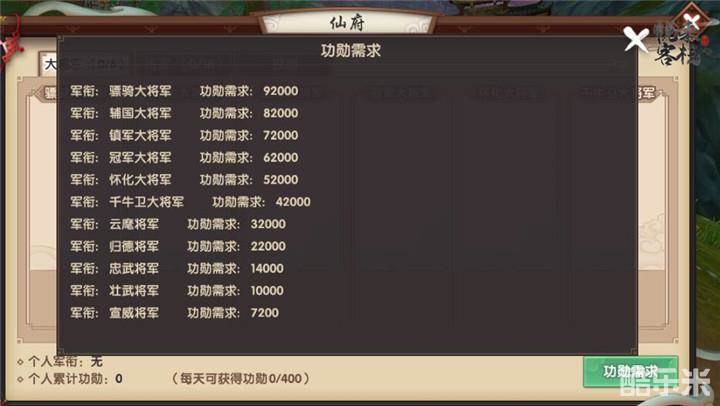 各位仙友按活动中所获得的功勋总量排名,当累积功勋达到需求后可被授予各种军衔。