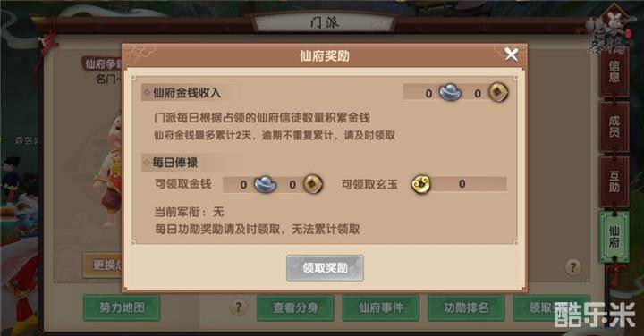 门派占领仙府后,根据所占领仙府的类型不同,每天会获得不同的金钱金钱及玉果奖励,各位仙友也可以在“门派—仙府—领取奖励”界面按仙府收入和自己的军衔领取相应的金钱及玄玉奖励。