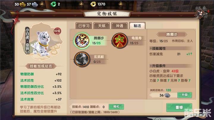 侍宠技能方面主要分为神通和秘法两种,神通技能是在宠物获取时便自带的,根据宠物品级的不同,技能、与技能的数量和品质都会有差别,宠物品级越高则技能数量越多,品质也会更好,而上品就要比中品多出两个技能,所以上品以上的宠物作为主宠物还是非常必要的。然后在技能方面推荐点会心和两个主要输出属性即可,其他的技能点则用于秘法技能。秘法技能是宠物与生俱来不会改变的技能,所以在选择宠物时一定要注意到这一点。另外秘法技能还需要宠物四维达到一定程度才能够开启,所以我们便可以利用接下来的宠物融合或者使用道具融魂精魄来将宠物四维进行提升。