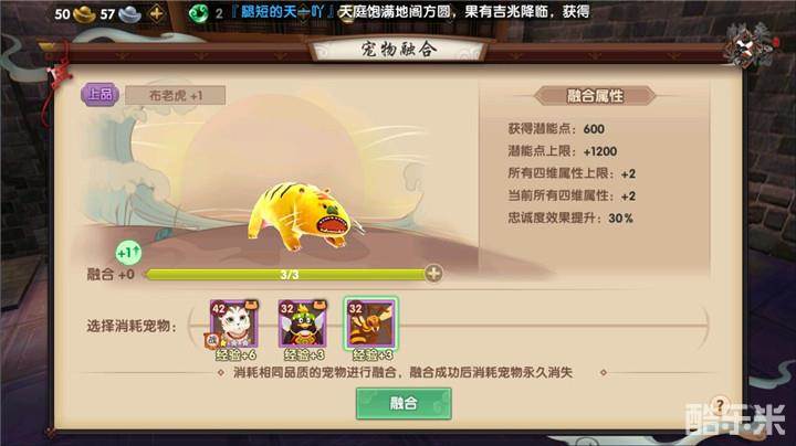 侍宠融合是侍宠的独特玩法,可以将品级相同的两只宠物进行融合,然后为侍宠提升融合经验,融合等级提升后回提升侍宠各方面的属性,融合等级最高能够提升至三级,每升一级则可以提升各项属性,有潜能点、潜能点上限、所有四维属性上限、当前所有四维属性以及忠诚度效果提升。侍宠的品级越高,则奖励的融合属性越高,就好比中品融合只能获得一点四维属性,而上品融合则可以获得两点四维属性。