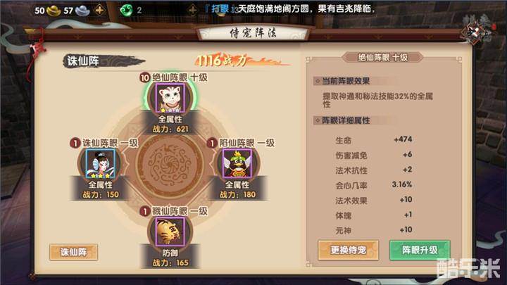 阵法也是战力的主要来源,我们可以将最多四只侍宠放在阵法里,并且阵法也分属性,在诛仙阵中,前三个阵眼都可以获得全属性加成,而第四个阵眼则只能获得防御属性加成,所以无论是对侍宠的选择或是培养方向都必须要把握住。而是用道具青玉髓则可以升级阵眼,从而让阵眼对属性的提取率增高,达到提升战力的效果。