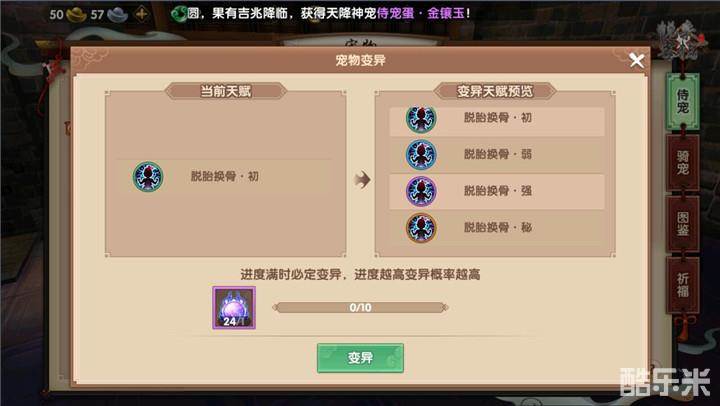 变异属性是侍宠非常独特的属性,除了与生俱来的属性之外,我们还可以将其提升至初、弱、强、秘四个等级,除了等级的划分,还有技能效果的不同。比如连击技能可以几率多攻击一次,而技能嗜血则是可以吸取血量,除此之外还有增加伤害或是防御的属性。我们用降尘丹便可以对侍宠天赋进行变异,从而获取更好的技能效果。