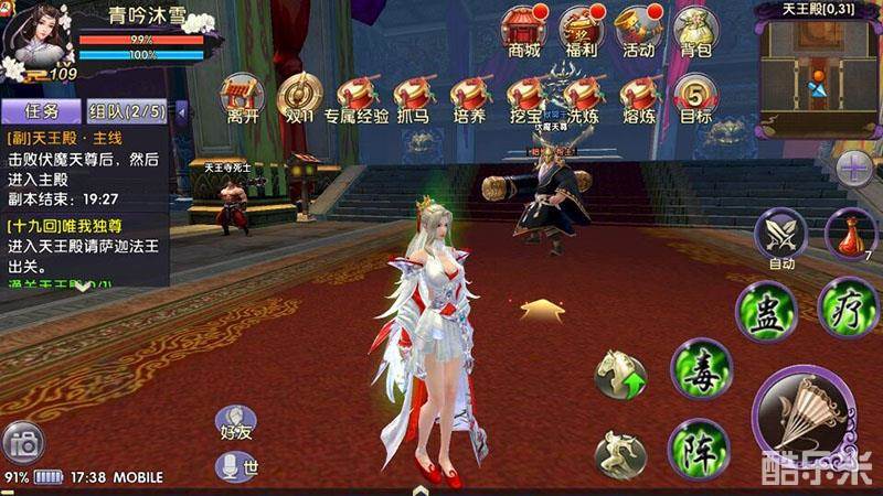进入天王殿之后先打败伏魔天尊(建议组队)然后清除小怪之后把伏魔天尊击败,就可以去上面的台子上吸引一堆小怪下来逐个清除掉,清掉台子上的小怪之后就可以直面萨迦法王了。