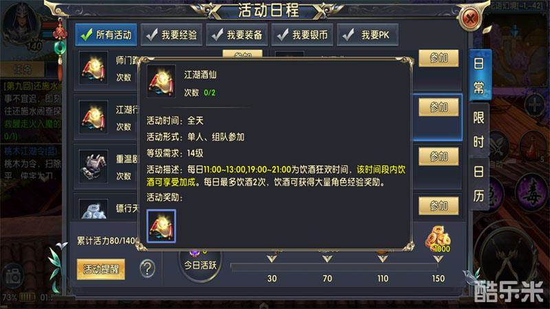 江湖酒仙可以说是玩家在游戏中接触到第一个可以获得大量经验的日常任务,前期每日两次的饮酒就能让角色升上好几级。所以即使是在后期需要大量经验的阶段这也是每天必不可少的活动,原因就是这是获取经验最便捷的手段,玩家不需要干什么,只要席地而坐就能看见经验蹭蹭蹭的上升。不过要注意此活动每天有两个固定时间段位饮酒狂欢时间,该时间段内可享受经验加成,玩家一定要选择好时间参加活动。