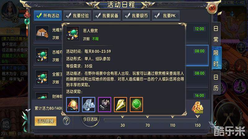 悬赏恶人任务会在每日上午8:00至晚上23:59开放,每一小时刷新一次。当玩家等级到达35级时,便可接取悬赏任务击杀榜上恶人。参与该任务可选择个人前往或组队配合,活动开始前5分钟系统会自动提示,玩家只需点击“寻路”即可自动寻路前往恶人所在地图挑战。击杀会获得超丰厚的经验,你输出的伤害越高,获得的经验越丰厚,也就是说你实力越强,经验就会越多,完全是为后期玩家准备的一个活动。