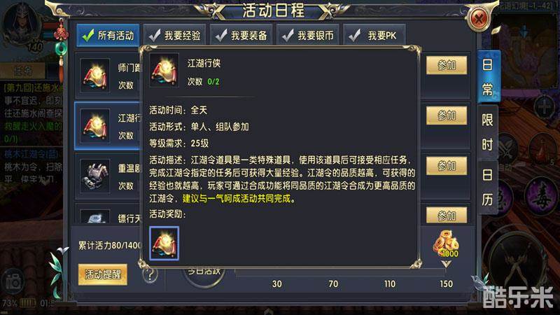 在达到25级后伴随开启的活动还有江湖行侠,想要参与此任务玩家需要消耗桃木令。使用该道具后可接受相应任务,完成指定的任务和可获得大量经验。桃木江湖令的品质越高获得的经验也就越高,玩家可通过合成功能将品质相同的桃木令合成为更高品质的桃木令。由于该任务主要就是杀怪,建议与上面所提的一气呵成活动共同完成,做到事半功倍。