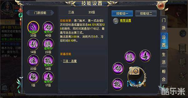 在搭配技能之前先了解一下唐门的职业特色,这是一个近战物理单攻,集隐匿和爆发为一体的刺客职业。无论是在副本还是在PVP中,都拥有极强的个人作战能力,结合自身技能特点主要以偷袭为主,打不过也能迅速撤退。这里推荐的技能搭配是三连+影切+剔骨+隐身+极速,唐门在野外对战讲究的是秒杀敌方脆皮,所以面对敌人时先隐身找机会近身控制,接着用影切打出破甲效果,三连叠加标记,剔骨打出爆发,最后使用极速重置技能再来一套。遇到有治疗的敌人可以把剔骨换为毒镖,对其进行禁招,优先击杀辅助。