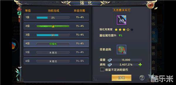 既然极品装备弄到手了,那么接下来就是对装备进行打造强化了。在《卧虎藏龙贰》中,每件装备的最大强化等级为六级,但是每级又有强化加成,强化加成越高装备属性也就越好,系统会根据强化完美度赋予装备不同的星级,相当于二次强化。在这里建议玩家把每一级强化加成值都提升到最大,这样属性才不会差。
