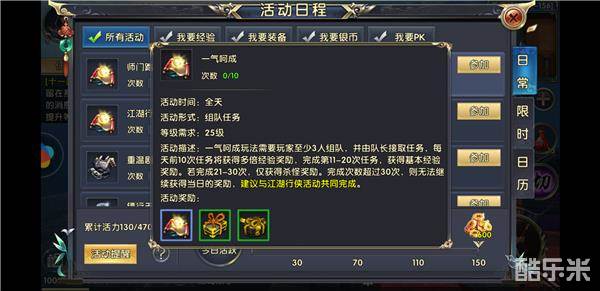 这个任务不论前期还是后期练级中,建议玩家都是每日必做的。这个任务经验是爆发般的丰厚异常,此玩法需要玩家至少3人组队,并由队长接取任务,每天前10次任务将获得多倍经验奖励。玩家在进行此任务时不妨连江湖行侠一起接取,这两个任务是相辅相成、互相配合的,玩家在接取活动的时候切记要两个一起,能做到事半功倍。