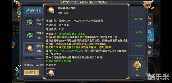 据点跑环这个任务在玩家达到45级后开启,据点活动需要在1线完成。值得一提的是,这个任务每天限时限量提供,玩家们一定要掐紧时间准时上线接取。若是据点归属帮会的成员可选择帮贡接取或金币接取,而其他玩家只能选择金币接取,但是任务完成后能得到丰厚的经验奖励。每天每个玩家只能选择2个据点进行跑环,请谨慎选择。