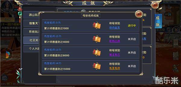 打开成就系统,在社交关系栏中就会发现传世名师成就。本成就一共分为七个阶段,每达成一个阶段就会获得一个称号,对于收集控玩家来说可又得忙活了。传世名师这个成就所需要的师德值与社交系统中师徒玩法挂钩,要想完成此成就你就必须有徒弟,别的不说,接下来进行详细介绍。