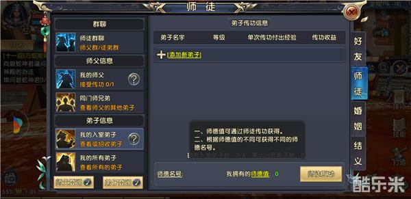 如果你等不及想要收徒开始做成就,不妨在师徒界面点击我的入室弟子,然后点击添加新弟子,这时候就可以看到一批登记了的徒弟,玩家可以根据自己的喜好选择收徒。玩家最多可以拥有四名入室弟子,在收徒完成后即可开启师徒传功,不过传功的最低要求为徒弟至少30级,你要想获得师德值得话在收徒的时候就要注意了。