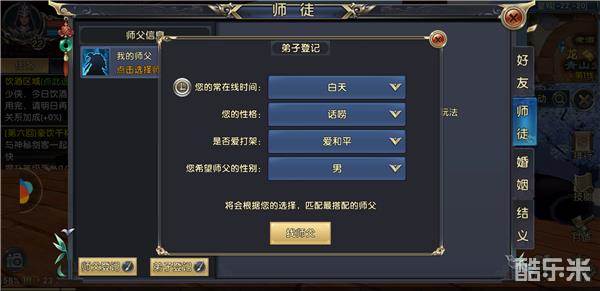 玩家在达到20级后即可开启师徒系统,可以在主界面找到社交系统,点开后在第二个页签就能找到师徒玩法。在40级之前,玩家只可以进行拜师。40级之后既可以选择拜师,同时也可以去收徒。玩家拜师的话可以在师徒界面左下角点击弟子登记选择完自己的在线时间、性格、是否爱打架、师父性别后,系统会自动匹配最搭配的师父。师父登记的话需要前往皇城师徒场所才能登记。
