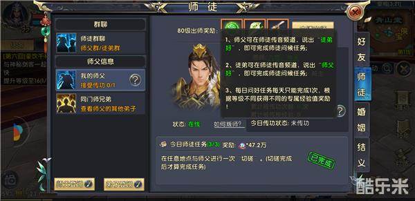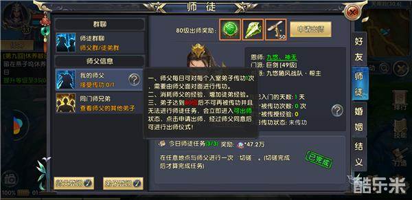 以上便是《卧虎藏龙贰》师徒玩法介绍了,萌新往往对江湖一无所知,没有个老司机师父带着会走不少弯路,还不赶紧找个师父带带你。机智的我在进游戏后立即拜师,师父对我很好,不懂的都会教我,主要还是经验多多,升级很快,游戏乐趣又增加了。