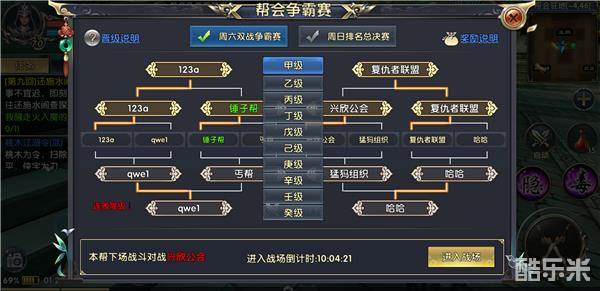 晋级说明:每周所有比赛结束后,每个级别组的前两名玩家晋级,如果没有更高的级别,则下周的争霸赛仍保持现有排名进行比赛;每周乙级、丙级、丁级三个级别组的前两名晋级更高的组别;若更高的组别空缺的帮会位置多于两个,则从下一个组别中选择名次靠前的帮会晋级至高级别组;对手空缺是按照轮空算作胜利。