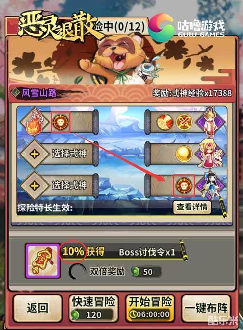 ①通过式神的探险技能克制敌人的特性,即每配对一个相同的技能,即可提升10%或20%的成功几率: