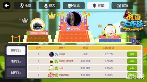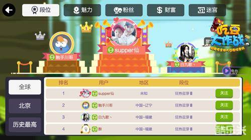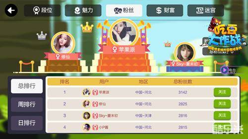 粉丝当道,人气为王!《吃豆大作战》粉丝排行榜分为日排名、周排名以及总排名三个部分。其中日排名以及周排名以玩家每日或每周新增粉丝数量进行排序。而总榜便是由粉丝总数决定,同样是前100的玩家都会荣登宝座,榜上有名!