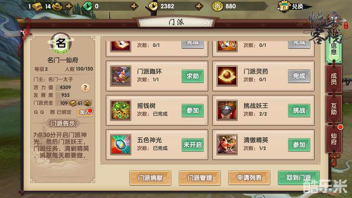 门派的相关玩法是获得经验的一个非常关键的渠道。像清剿精英、门派神光这两个活动加起来获得的经验可以达到上百万。门派神光各门派的开启时间不一,完全是看管理的意愿,清剿精英因为怪物难度较高的原因,因此最好是组队前往。我个人推荐大家可以在门派神光之后,在门派中召集仙友去完成任务。