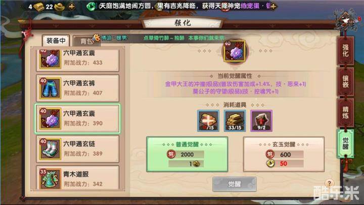 由于觉醒能力不俗,故仙界限令等级30级以上的锻造装备才能觉醒。