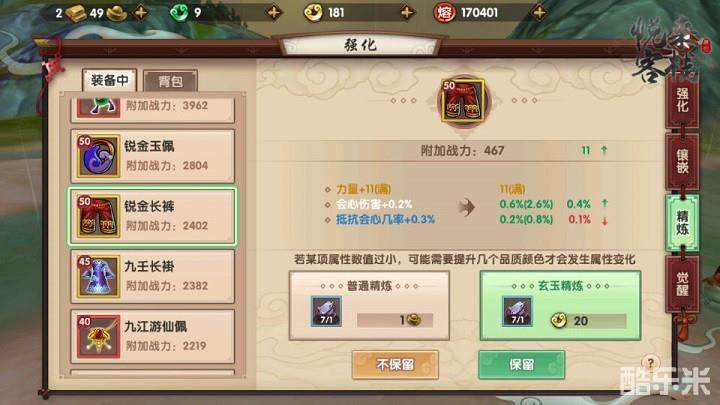 装备精炼的属性也分几种颜色分别是:白色、绿色、蓝色、紫色、金色,这几种颜色依次排列提升的战力由低到高。在精炼时会显示出精炼后的属性和精炼之前的属性综合对比统计,如上图。如果统计结果显示战力提升那么大家可以选择保留。每次精炼不一定都会提升装备属性,通过精炼使属性减少的情况也是经常可以见到的,如下图,这时候大家可以选择不保留,这样属性和战力不会变。精炼时也有可能会精炼出满属性的,如果精炼出来的属性后面显示一个(满)就说明这条属性已经到了最大值,之后再精炼这条属性也不会再改变了,那仙友们可以继续精炼装备的其他属性直到此装备的其他属性都是金色满为止。