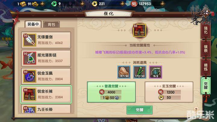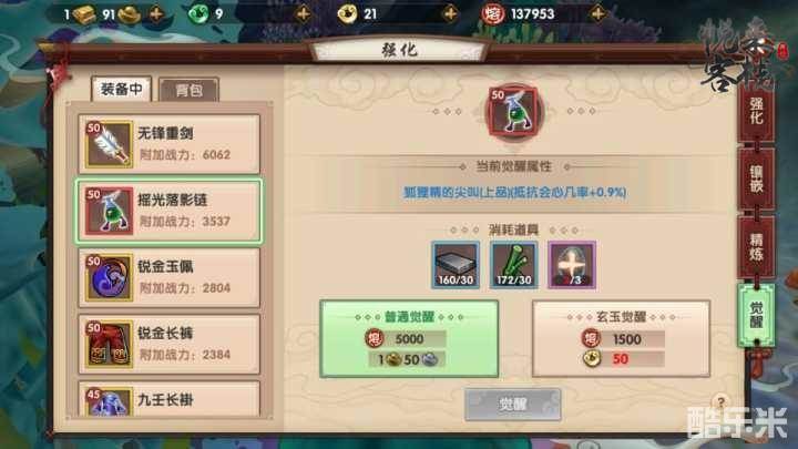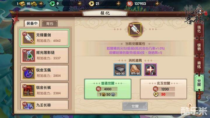 装备锻造成功后觉醒出来的属性如果各位仙友不满意可通过普通觉醒和玄玉觉醒来刷新觉醒的属性。觉醒装备的材料除了石头以外都好得到,对应级别的装备打对应的副本会得到大量材料,石头在副把中需要随机抽取才能得到而且还不一定是暂时能用得到的,这里就需要各位仙友到交易所看看了。交易所每半个小时会刷新一次,手快者得。有了材料后小仙强烈推荐各位仙友选择玄玉觉醒,这样大大提高了觉醒极品属性的概率,而且运气好的话还有概率会觉醒出仙品属性,那可是梦寐以求的。觉醒高属性的概率提升了也就省了购买石头和材料的钱,还是非常划算的。