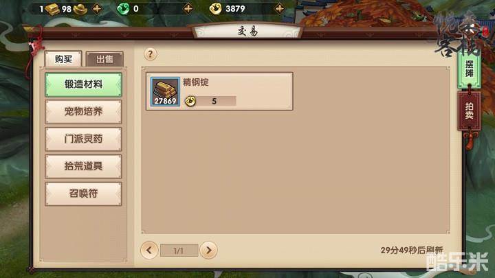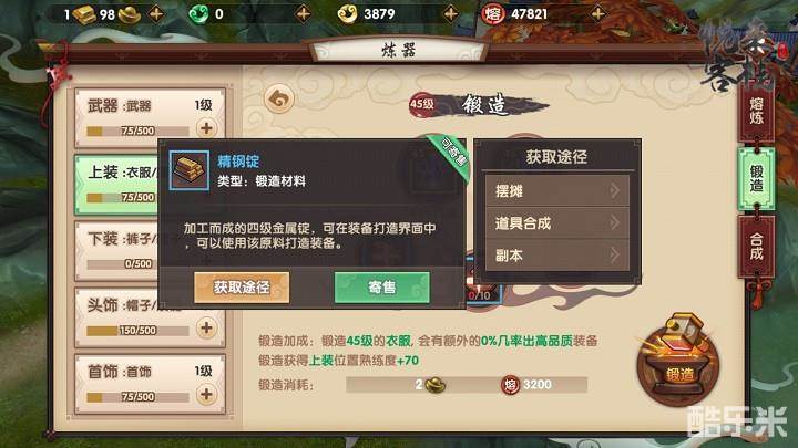 继续拿衣服的例子来说,我锻造这件衣服需要精钢锭,而我缺少这些东西,我点开需求界面的素材缺少符号,会有精钢锭的素材界面弹出来,下面有两个选项,获取途径跟寄售,我们缺少这个素材,自然是选择获取途径,在右边就会弹出获取途径。精钢锭获取途径:摆摊、道具合成、副本。