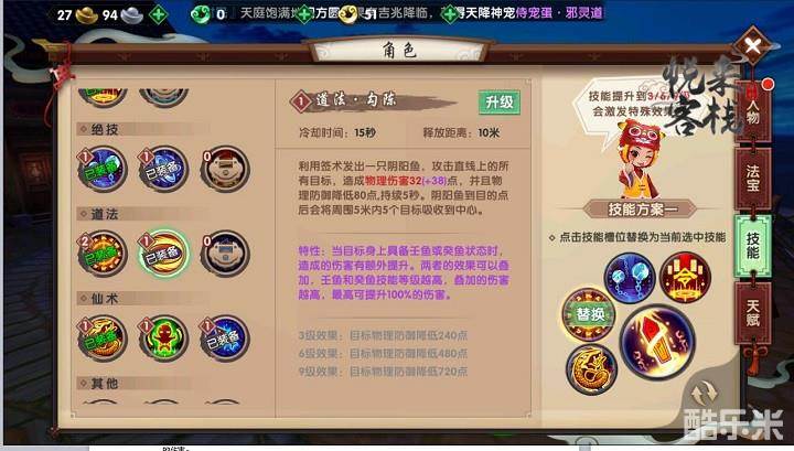利用签术发出一只阴阳鱼,攻击直线上的所有目标,阴阳鱼到目的点后会将周围的目标都吸收过来。提示:当目标身上具备壬鱼、癸鱼状态时,造成的伤害大幅提升,两者的效果可以叠加,最多可提升100%的伤害。