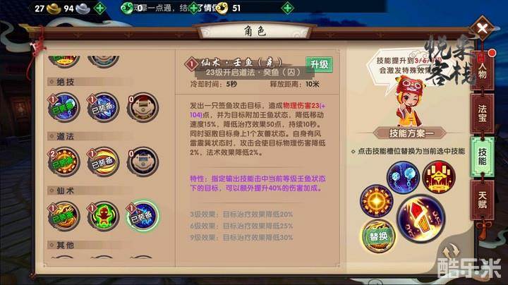 发出一只签鱼攻击目标,降低目标的移动速度并驱散目标的身上一个友善状态,另外还使目标收到的治疗效果降低,给目标增加壬鱼状态。有风雷状态则目标攻击力降低。