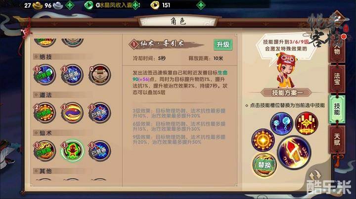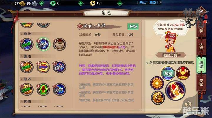 而在队伍治疗不足的时候,则可以利用仙术·引导术来帮助队伍回复,在回复的同时也能够为己方队友增添三种增益BUFF,它们分别是提升物防、提升法抗和提升被治疗效果,三种增益效果都可以让队伍的生存能力变得更高。而在后期时,将自身绝技技能绝技·辟邪技能效果提升至三级以上后,也可以在释放时将自己的伤害转化为自己和队友的生命回复,而且装备该技能后任何技能命中敌人都会提升自己的被治疗效果,自己回复能力变得更强,生存能力也随之提升。