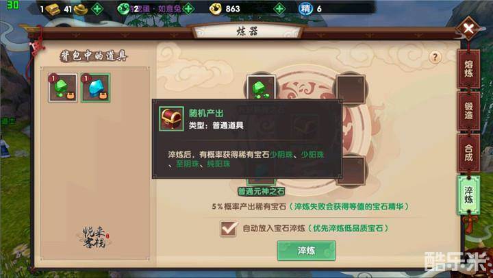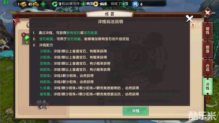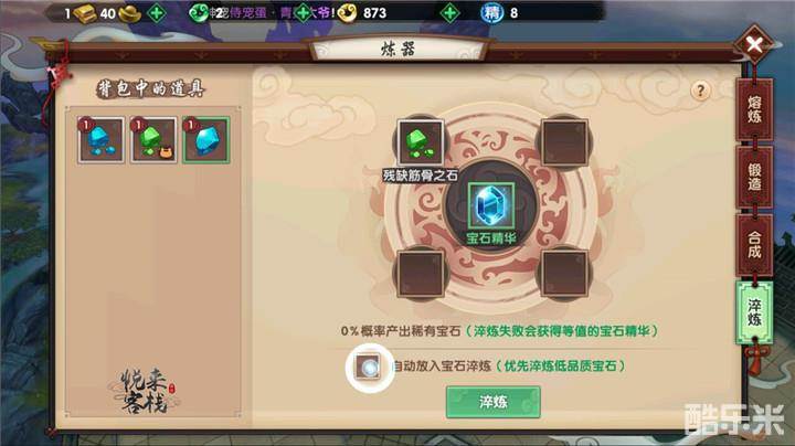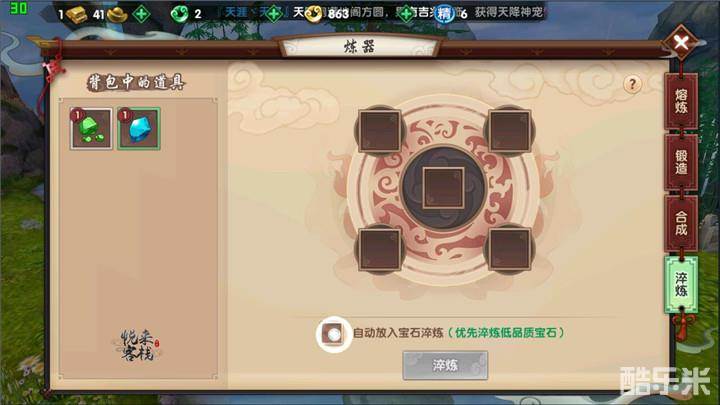 打开炼器中的淬炼界面,放入宝石,就可以进入淬炼。淬炼完成后,依据配方可获得对应的稀有宝石或宝石精华。