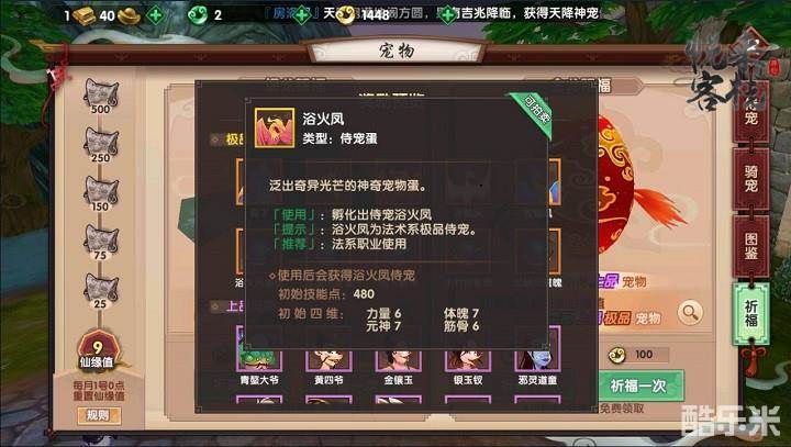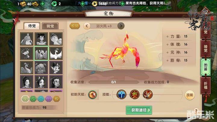 浴火凤为极品(橙色)侍宠,四维属性初始为力量6、体魄7、元神7、筋骨6,全属性单个最大可达到19点,这样需要在融合系统中将浴火凤升至三级才行。而其因为是极品(橙色)侍宠,所以在神通技能方面则能够拥有六个,并且能够从所有技能随机池中随机抽取属于自己的技能。