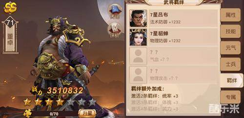 董卓的羁绊显而易见:董卓吕布貂蝉三者互为羁绊,铁三角密不可分,比爱情更像爱情。7星吕布为董卓提供法术防御加成,7星貂蝉为董卓提供物理防御加成,试想,三位同时上阵并肩作战,那场景多么威风八面,简直不敢想!小编要赶紧攒碎片去升星了!