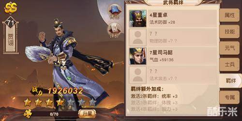 号称“毒士”的贾诩奇谋百出、算无遗策,先后服务过董卓、张绣、曹操等主公,后来暗助曹丕,作为曹魏开国功臣,在三国乱世活到77岁高龄,实属不易。在《一骑当千2》中,贾诩的羁绊有老上司董卓、魏国同事司马懿等。其中4星董卓可提供法术防御加成,司马懿提供气血加成。