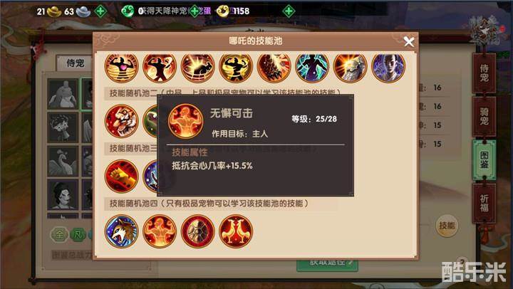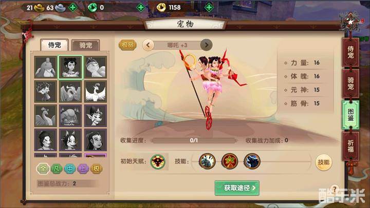 极品(橙色)侍宠哪吒能够从所有技能池中随机抽取六个技能供自己使用,而依照其自身的增益效果来看则推荐选择弱点勘破、批亢捣虚等会心方面的神通技能,因为这些独特的会心属性可以让仙友们的实力成倍提升,哪吒的职业推荐为物理系职业,也就是奇门游侠、御剑游侠或者金刚力士使用起来比较妥当,而且神通技能最好也选择为提升物理系属性的技能比较好。