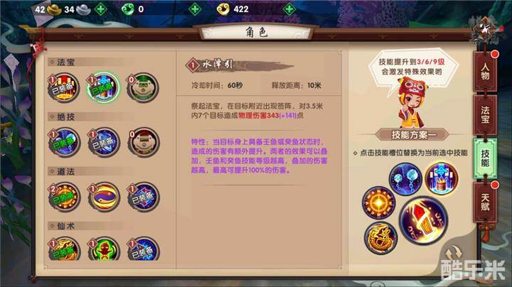 祭出法宝,在目标附近出现大量的签鱼,攻击范围内的7个目标,大幅减速敌人并每次攻击造成伤害。该技能可以减速90%,在PVP中可以极大的限制地方活动。