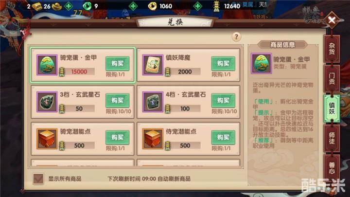 镇妖声望兑换一览:骑宠蛋·金甲、风物志、骑宠潜能点、侍宠潜能点、40和50的橙色武器礼盒、塔装图纸及装备制作的石头材料。