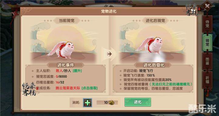 当然还有另外一种飞行方式,那就是当我们的骑宠进化后会开启骑宠飞行功能。骑宠的飞行速度为150%,同时骑宠所有被动技能属性提高20%。骑宠的四维会被重铸,无法归元之前的魂魄精元,但是保留骑宠的等级,四维总星度以及忠诚度。