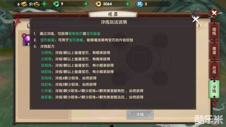 宝石的获取方法:稀有宝石的获得通过打开炼器中的淬炼放入宝石之后进行淬炼,需要按照玩法说明里面的方式才能有概率产生稀有宝石。普通宝石可以通过天劫试炼来获得,基本每层都会有一颗宝石,仙友对抗活动中每日首胜也会给一颗宝石,另外大家可以召唤珊瑚妖王和玄龟老祖打败后也会获得宝石,每日三次。形神竞技中仙友们达到指定的积分可以领取宝石,门派清缴玩法中也是可以领取宝石的。通关挑战副本会产出忽略法抗或者忽略物防的宝石,仙玉商城里也有卖残缺宝石(各位仙友量力而行)。