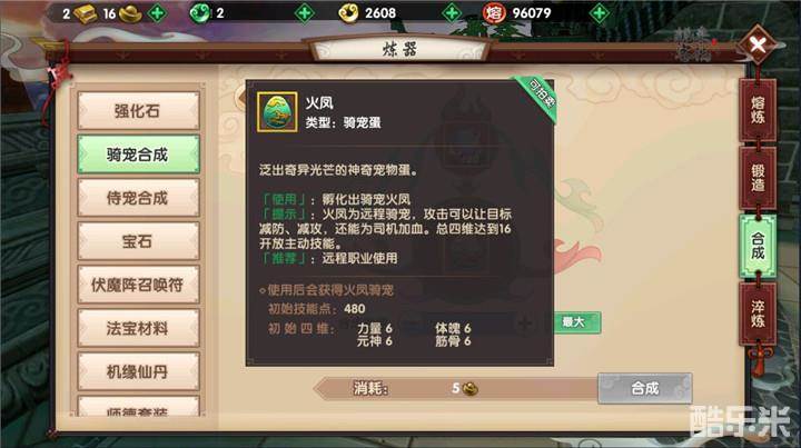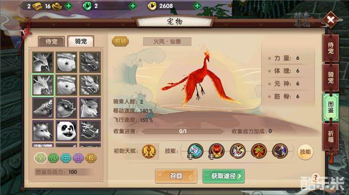 极品(橙色)骑宠火凤能够从所有技能池中随机抽取六个技能供自己使用,而依照其自身的增益效果来看则推荐选择弱点勘破、批亢捣虚等会心方面的神通技能,因为这些独特的会心属性可以让仙友们的实力成倍提升,由于火凤是全职业通用骑宠所以神通技能尽量偏向自己职业特性即可,物理系选择物理技能,法术系则选择法术技能。