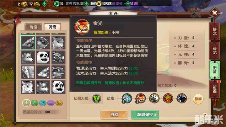 上品(紫色)骑宠穿山甲能够从技能随机池一、二、三种随机抽取技能供自己使用,而依照其自身的增益效果来看则推荐选择弱点勘破技能,因为独特的会心属性可以让仙友们的实力成倍提升,但由于其偏向防御又不能抽取第四池中的伤害减免等大量防御技能,所以在神通技能方面会让金刚力士吃些亏。所以在其他的神通技能方面尽量选择防御系比较适合金刚力士。