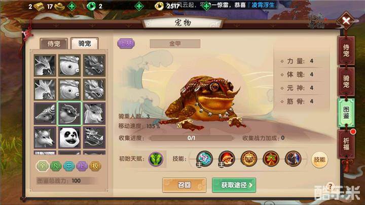 金甲是一只外形并不是很好看的骑宠,它是一只黄铜色的大蛤蟆,鼻子上还长了个角,不过身上却有很多金银配饰,好像很有钱的样子。金甲由于获取方式较为容易,所以在寻仙手游的世界中,有许多仙友都使用着这只骑宠,虽然它外形不属于灵动秀美型或呆萌可爱的,但实用效果却还是不错的,所以在寻仙手游中大家会经常见到有仙友使用这只宠物。