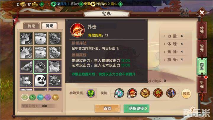 上品(紫色)骑宠金甲能够从技能随机池一、二、三种随机抽取技能供自己使用,而依照其自身的增益效果来看则推荐选择弱点勘破技能,因为独特的会心属性可以让仙友们的实力成倍提升,几乎每个仙友都需要这个技能。但由于其偏向防御又不能抽取第四池中的伤害减免等大量防御技能,所以在神通技能方面会让金刚力士吃些亏,不过在其他实际技能上倒是很适合物理系职业使用,属于典型的物理系输出种类的骑宠。