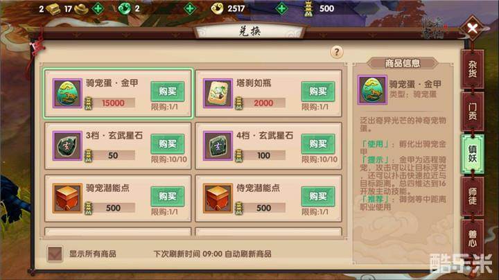 金甲的获取方式要比其他的骑宠容易一些,除去一些和在浮空岛的宠物蛋玩法以外,金甲的获取基本上都是从兑换中得来的,在镇妖塔商店的兑换中,我们可以使用1.5w的声望值来兑换一只金甲,虽然1.5w声望也不少,但是毕竟是可以刷刷刷就能得来的,所以还是很多仙友会去兑换来使用。